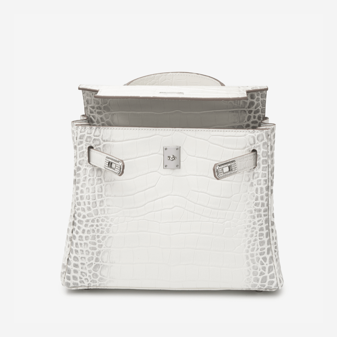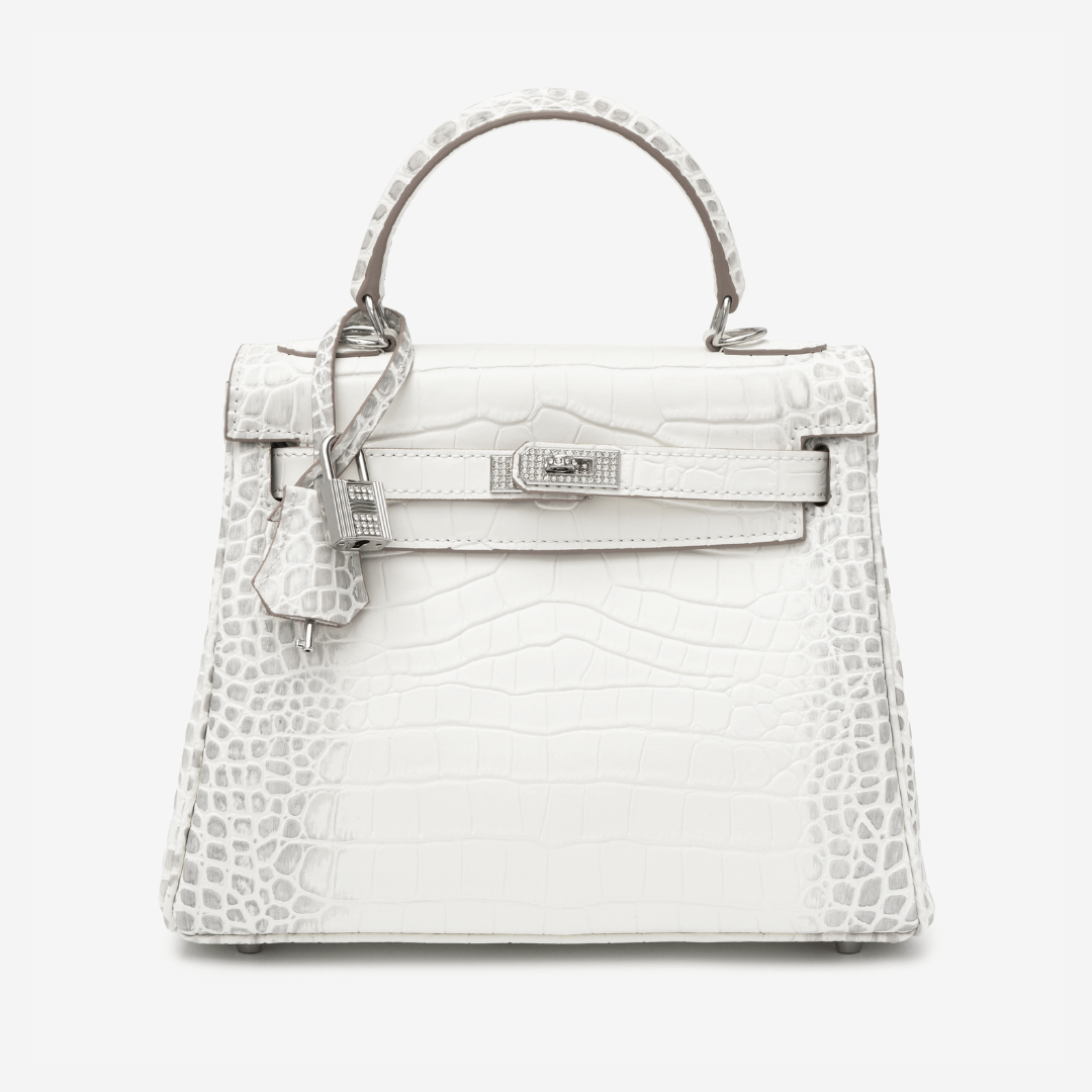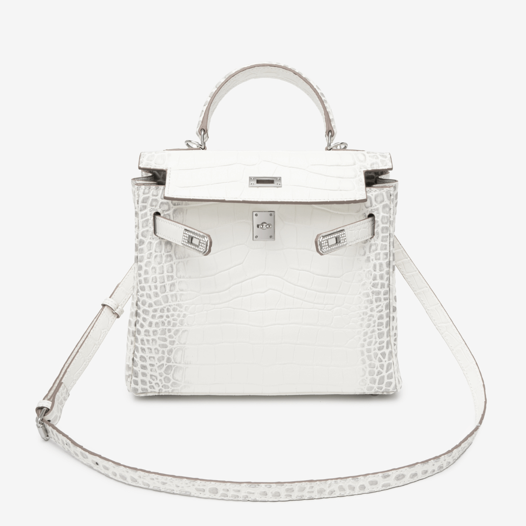 The Himalaya bag brings drama in all the right ways. Croc-embossed leather in a cool white finish, silver-tone hardware, and a structured silhouette make it a bold yet timeless piece. Spacious enough to fit tablets and elevate your every day.