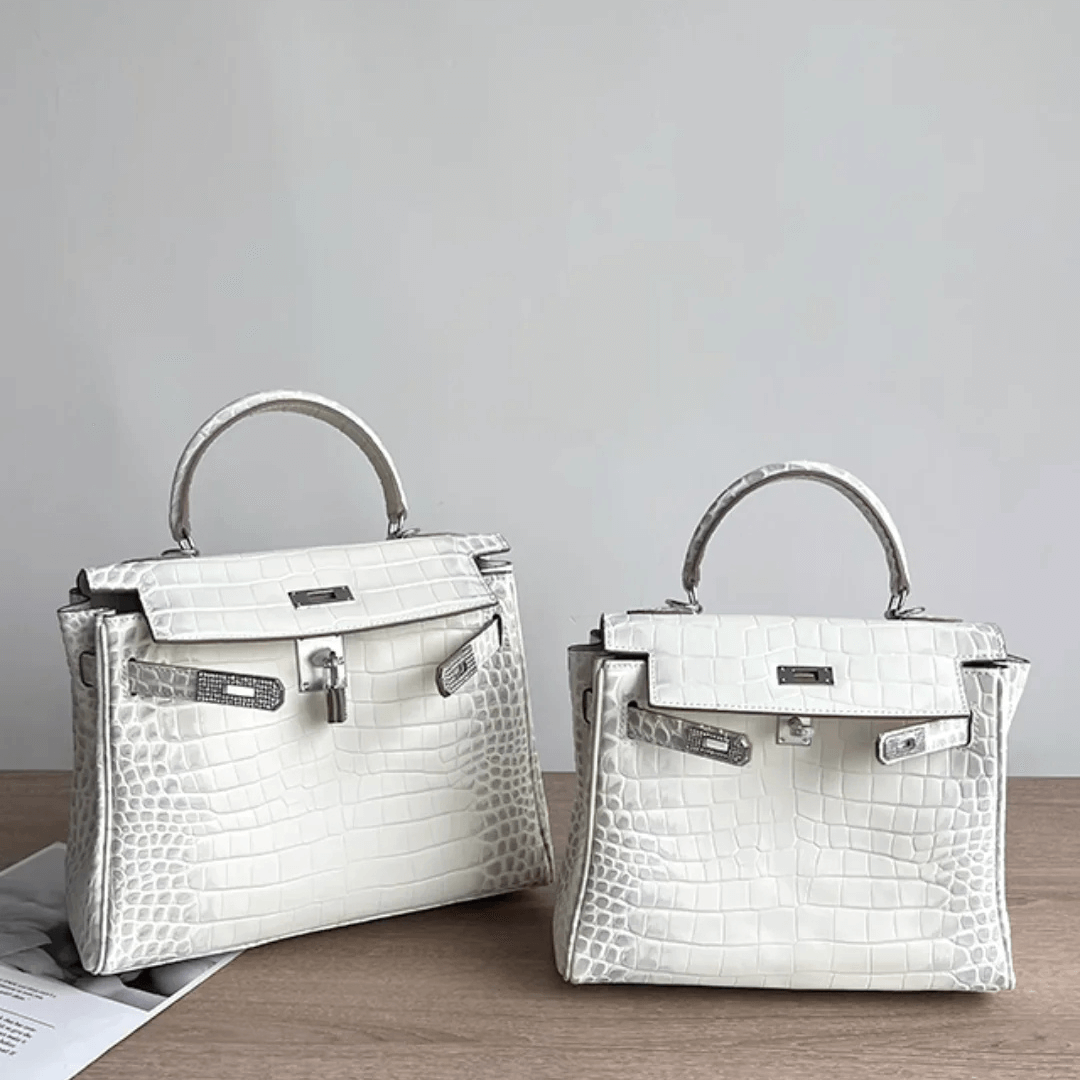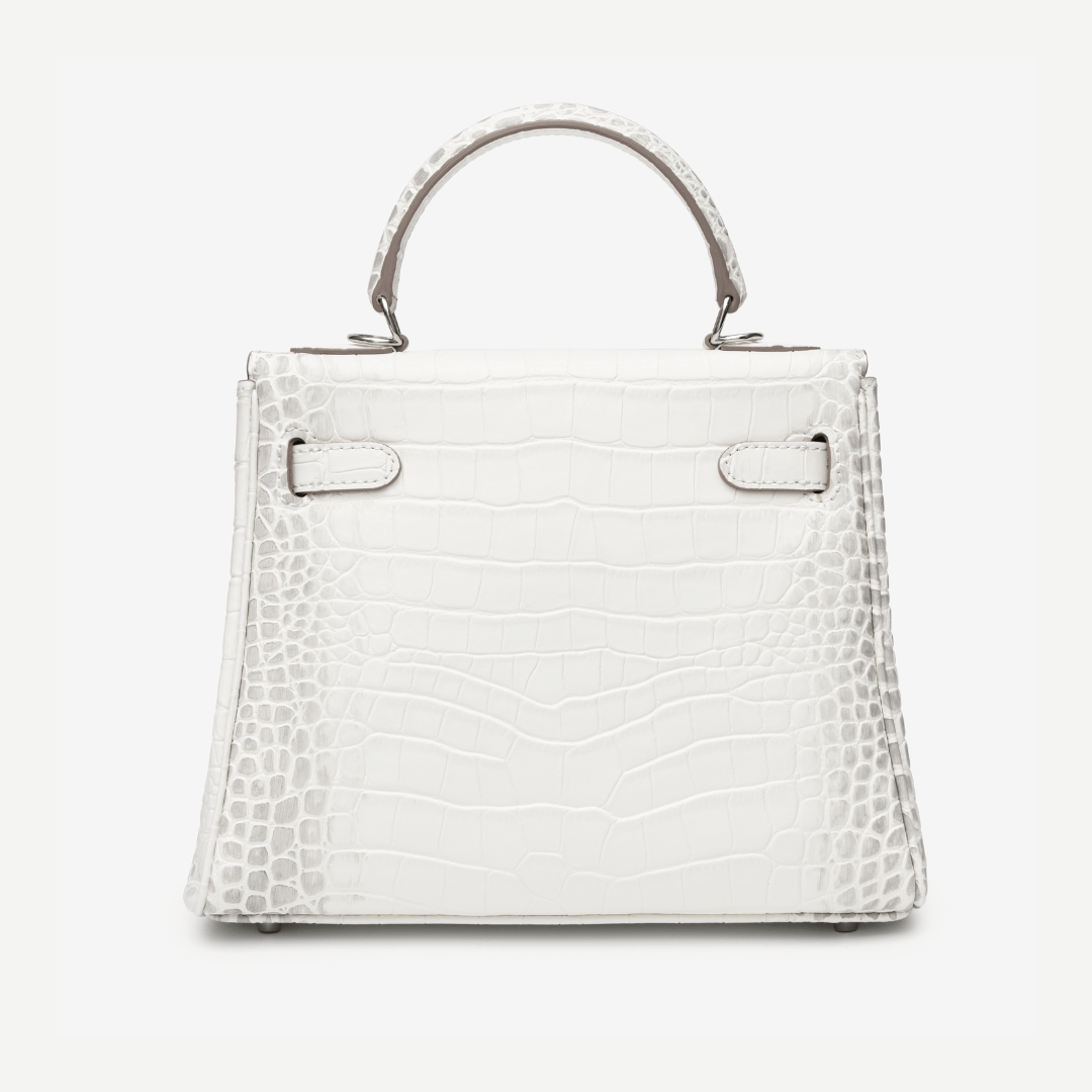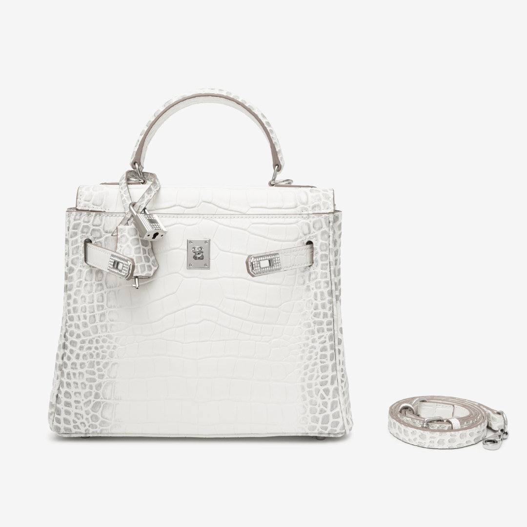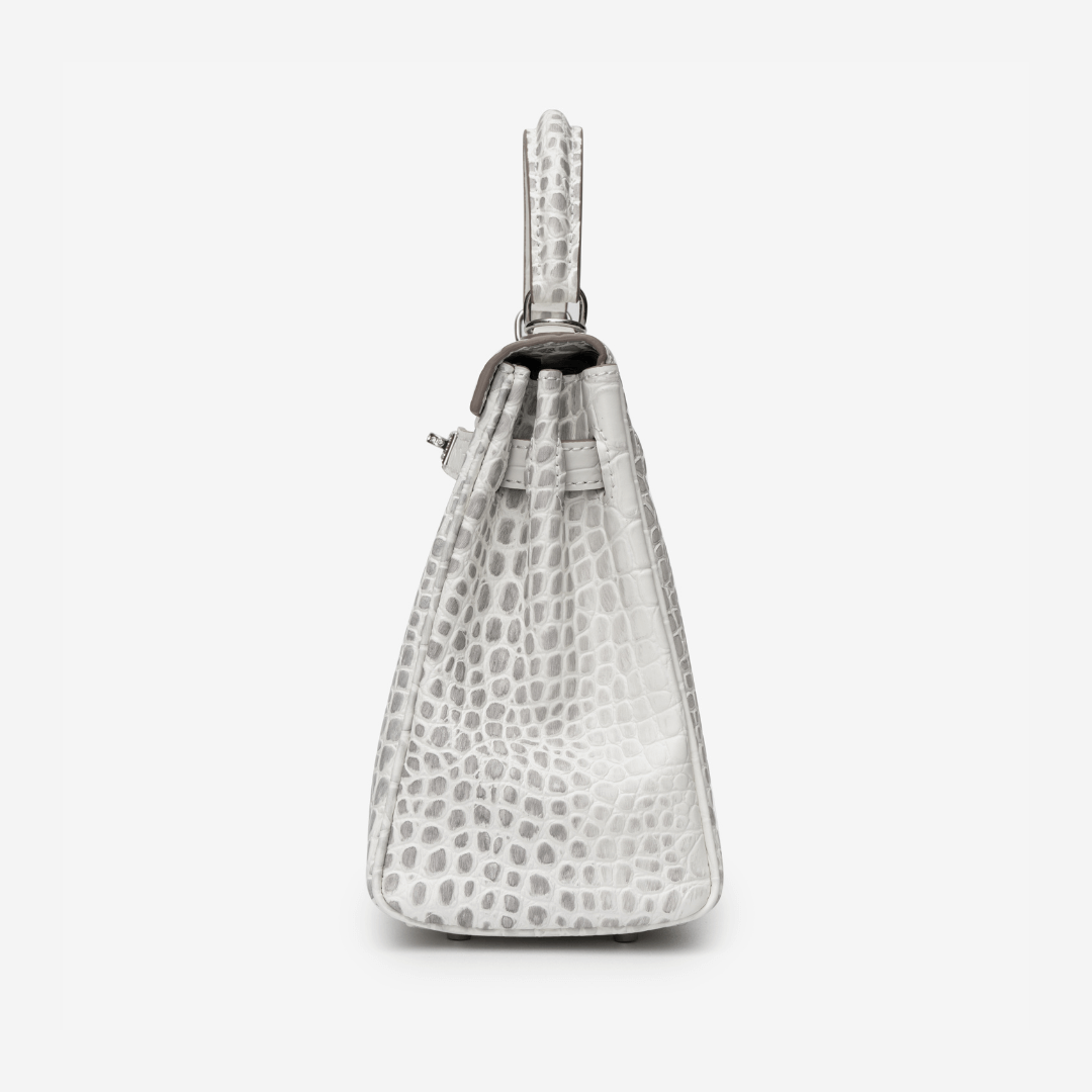 The Himalaya bag brings drama in all the right ways. Croc-embossed leather in a cool white finish, silver-tone hardware, and a structured silhouette make it a bold yet timeless piece. Spacious enough to fit tablets and elevate your every day.